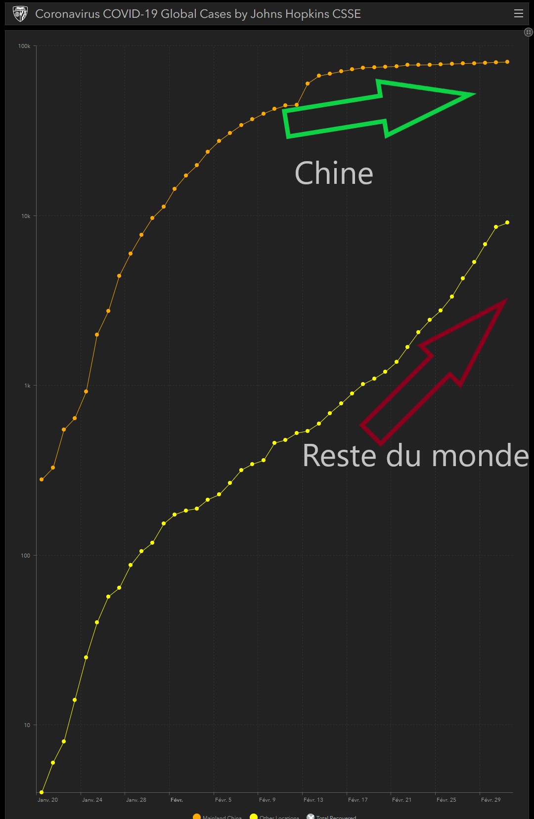 Pour estimer que le sujet Coronavirus est derrière nous d’un point de vue boursier et investir de manière plus fondamentale, nous souhaiterions voir la courbe, en échelle logarithmique, des personnes infectées hors de Chine infléchir sa tendance comme en Chine.