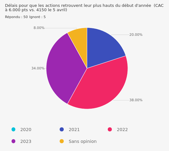 Aucun des répondants ne voit le CAC 40 retrouver ses plus hauts cette année. 72% s'attendent à un retour au plus haut en 2022 ou 2023.