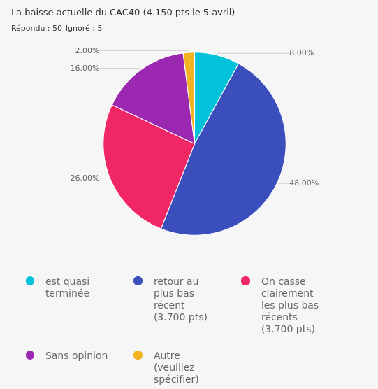 Pessimisme confirmé par le fait que près des 3/4 des répondants s'attendent à ce que le CAC40 aille revoir ses plus bas. Seul 8% estiment que l'essentiel de la baisse est faite.